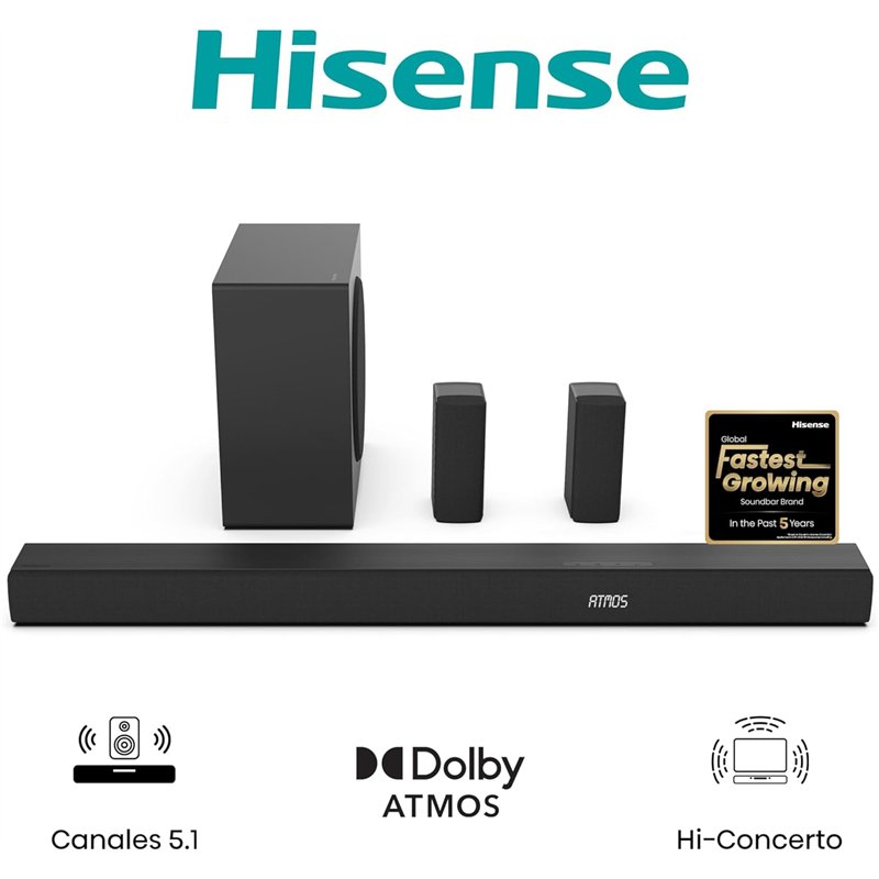 El subwoofer inalámbrico de 200 W y 6,5'' aporta graves potentes y precisos, mientras que la conectividad Bluetooth 5.3 y HDMI eARC 2.1 proporcionan máxima versatilidad para conectar televisores, consolas y dispositivos móviles sin perder calidad. El diseño elegante en color negro combina perfectamente con cualquier espacio, y la integración EzPlay facilita el control directo desde televisores Hisense. Su configuración plug & play y la ausencia de cables molestos gracias los altavoces traseros inalámbricos hacen que la instalación sea sencilla y limpia.