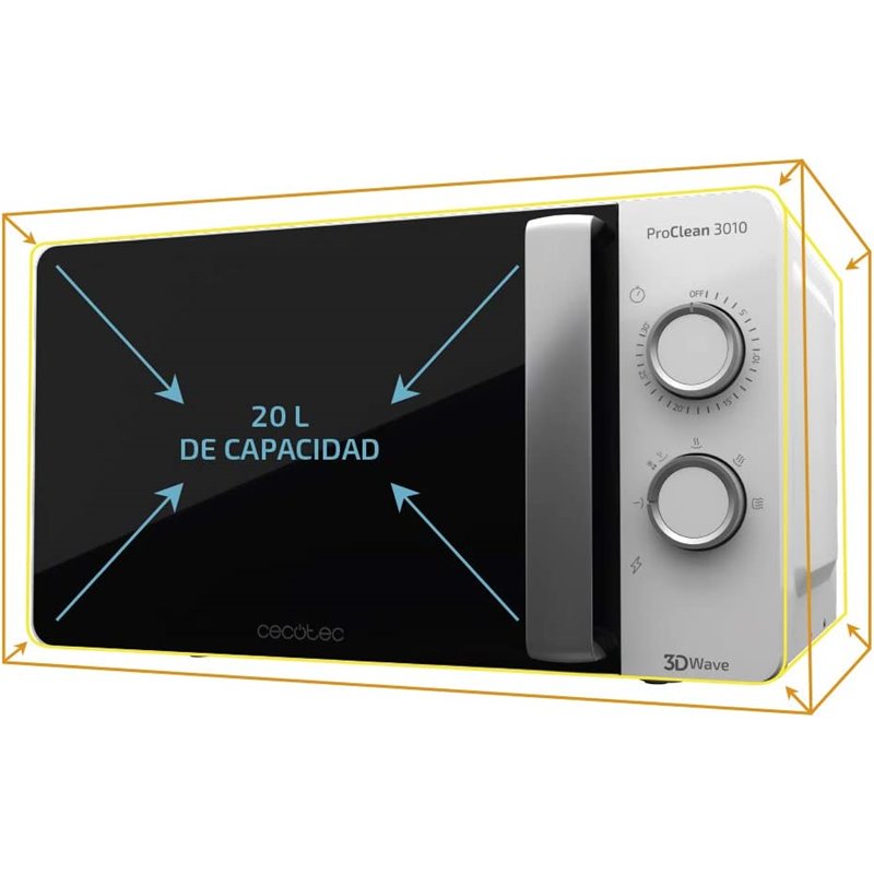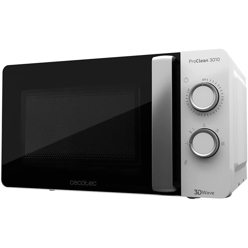 Microondas blanco con revestimiento Ready2Clean para una mejor limpieza. Tecnología 3DWave, input 1150 W, output 700 W. 20 l. Diseño elegante con puerta FullCrystal. 6 niveles. ProClean 3010 de Cecotec.
