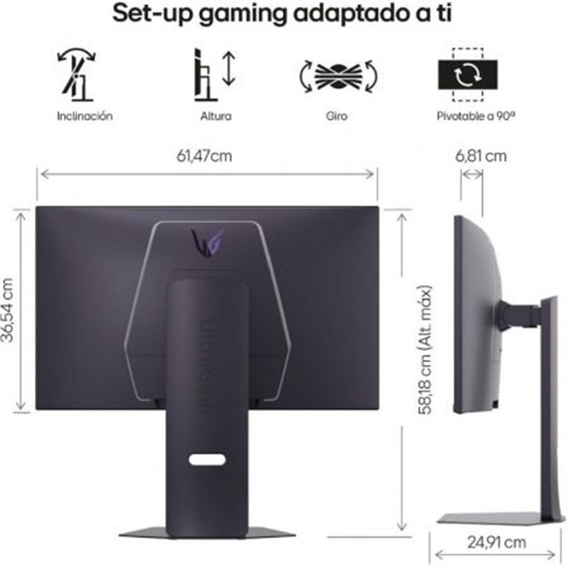 Diseño sin bordes, iluminación LED RGB y soporte ajustable en altura, giro, pivot e inclinación.