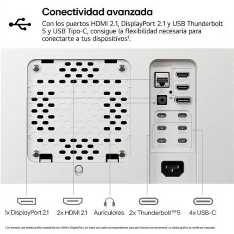 Conectividad avanzada: Thunderbolt (entrada/salida), HDMI 2.1, DisplayPort 2.1, USB-C, LAN RJ-45 y KVM integrado.