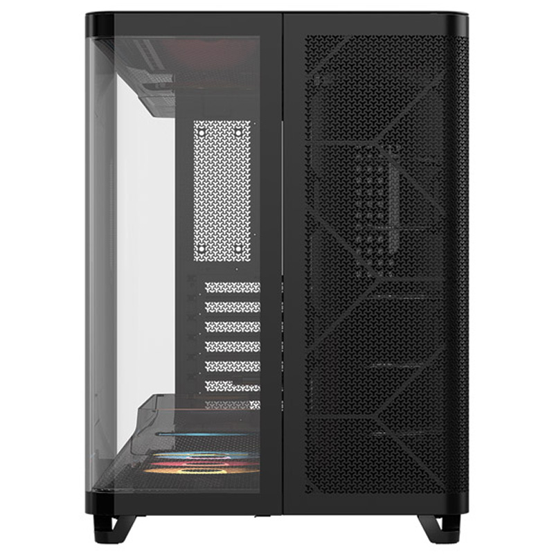 Gracias al cristal panorámico curvo, tu hardware se exhibe con una vista inigualable desde cualquier ángulo, fusionando rendimiento e impacto visual en un chasis robusto y fácil de manipular, especialmente por sus paneles con bisagras ocultas. La gestión de cables RapidRoute 2.0 reordena el interior con soportes giratorios y zonas dedicadas a cada conector, favoreciendo builds limpias y reducción de interferencias.