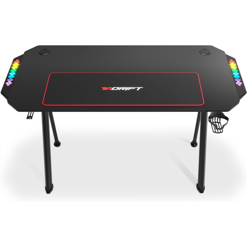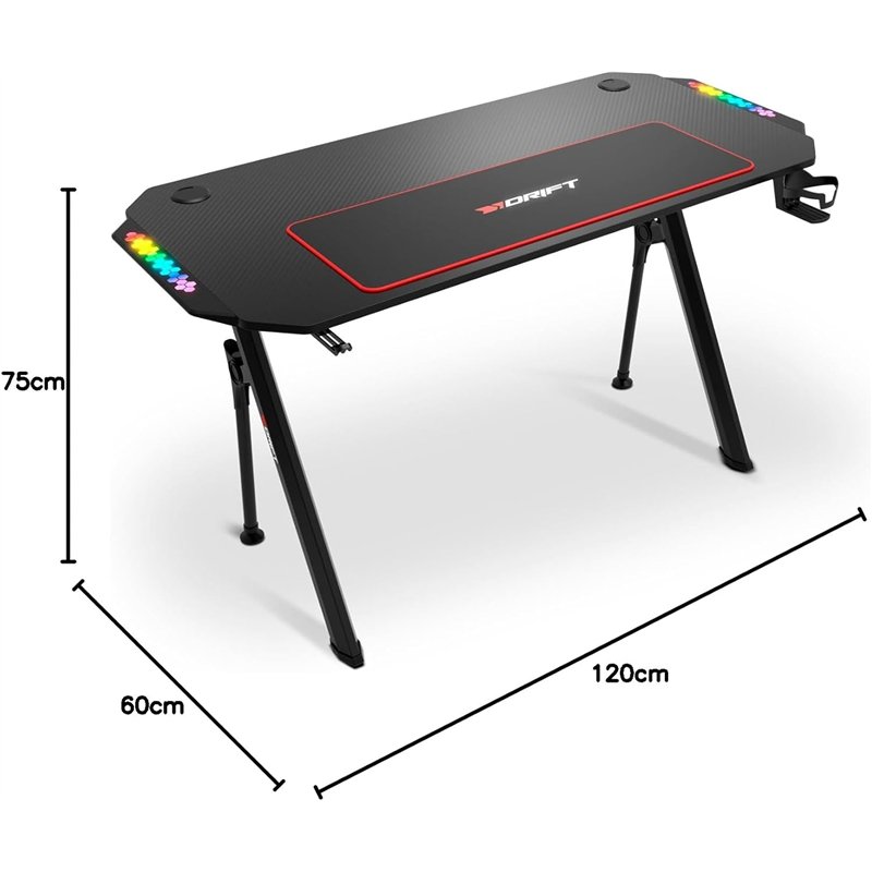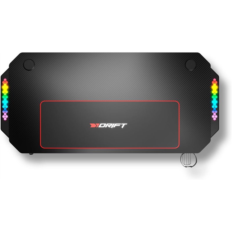 Drift DZ175 es una mesa gaming en fibra de carbono con alfombrilla full size, altura ajustable, reposavasos, soporte para auriculares, sistema de organización de cables e iluminación RGB reactiva al sonido.