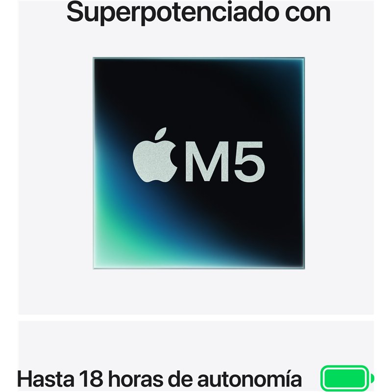 | Procesador | Apple M5, 10 núcleos CPU (4 rendimiento, 6 eficiencia), 10 núcleos GPU, 16 núcleos Neural Engine |