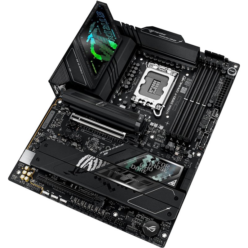 DOMINACIÓN DDR5. El enrutamiento de señal mejorado puede llevar a los kits de nivel entusiasta mucho más allá del umbral de 8 GT/s del Strix Z890-F.