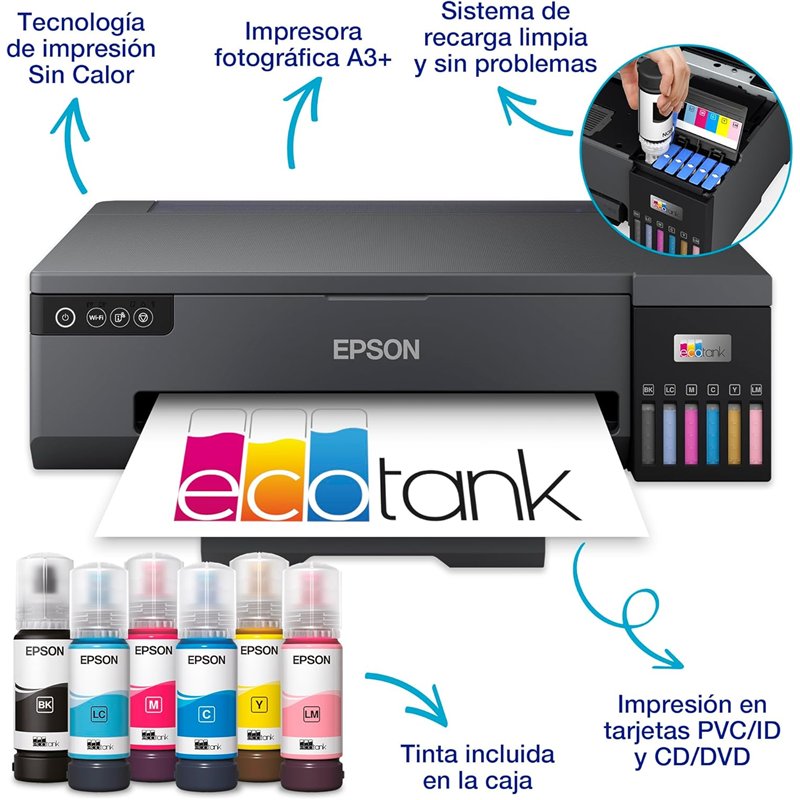 Este modelo es ideal para la impresión de grandes volúmenes de fotos de alta calidad, con un bajo coste por foto. La ET-18100 también ofrece impresión inalámbrica de fotografías e impresión sobre tarjetas de identificación de PVC, CD y DVD. Evita las interrupciones con la caja de mantenimiento sustituible de fácil acceso y el rodillo de recogida de papel. Con una garantía estándar de 1 año o de 50 000 páginas², la ET-18100 te aporta tranquilidad, para que puedas centrarte en sacar buenas fotos y olvidarte de lo demás.