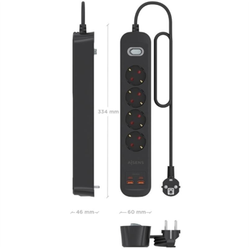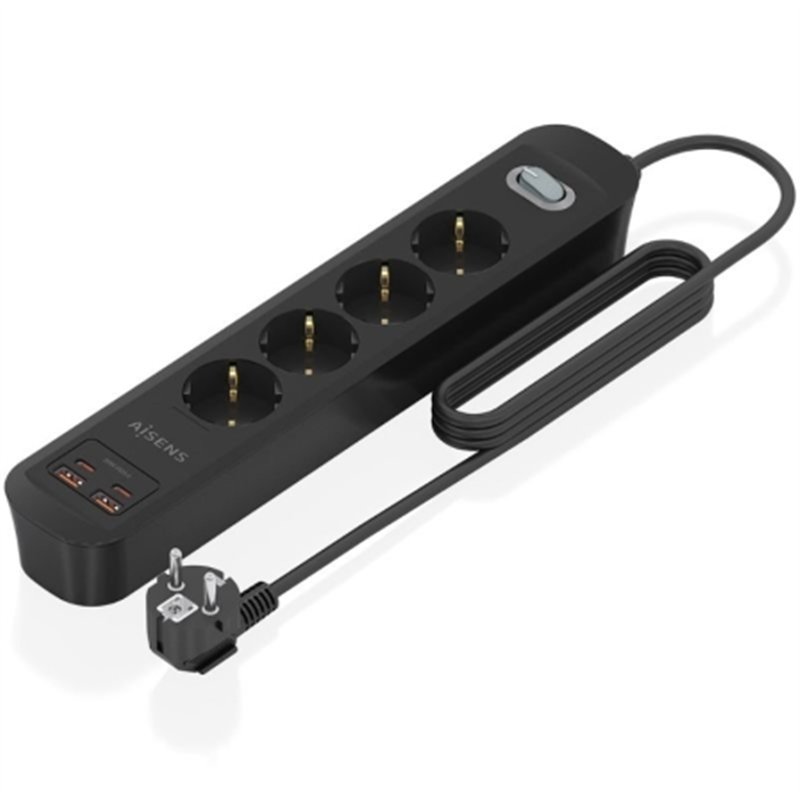 Regleta de enchufes con interruptor, 4 tomas Schuko, 2 puertos USB-C y 2 puertos USB-A. Incorpora un cable de alimentación de 1.4 metros con sección de 3x1.5mm².