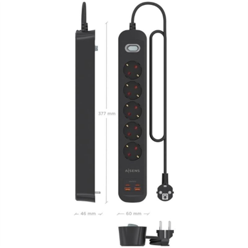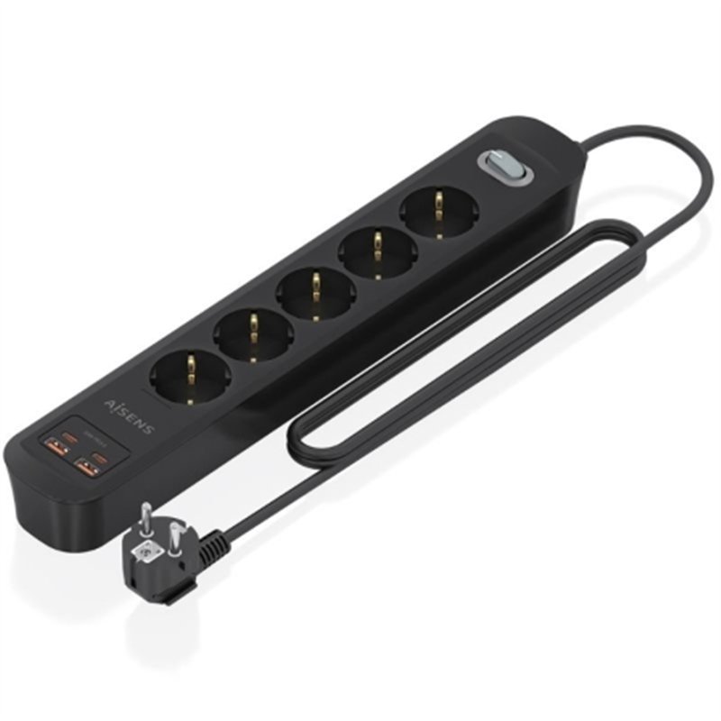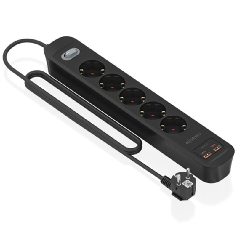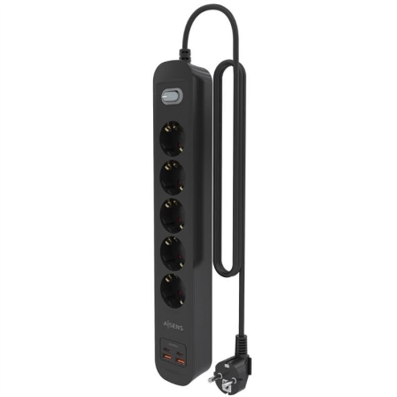 Regleta de enchufes con interruptor, 5 tomas Schuko, 2 puertos USB-C y 2 puertos USB-A. Incorpora un cable de alimentación de 1.4 metros con sección de 3x1.5mm².