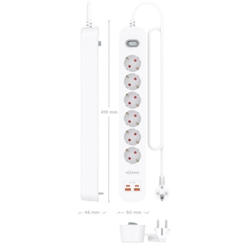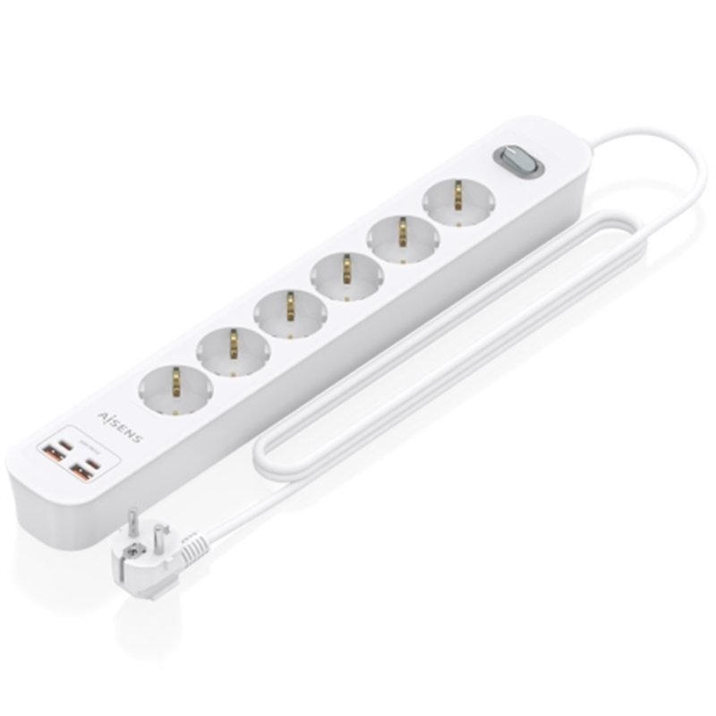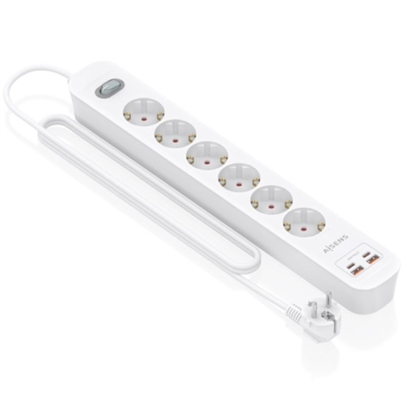 Regleta de enchufes con interruptor, 6 tomas Schuko, 2 puertos USB-C y 2 puertos USB-A. Incorpora un cable de alimentación de 1.4 metros con sección de 3x1.5mm²