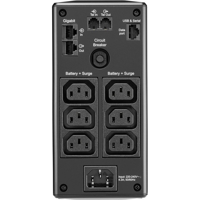Tomas exclusivas para subidas de tensión y protegidas por baterías: Reserva la capacidad eléctrica y el tiempo de autonomía para el equipo conectado que requiere batería de reserva y ofrece sólo protección contra sobrecorrientes para equipos menos importantes.