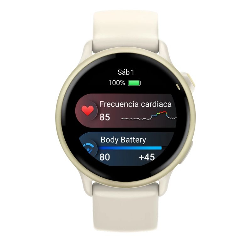 Controla el estado de salud las 24 horas del día con funciones como pulsioximetría y el monitor de energía Body Battery™, y realiza un seguimiento de la respiración, el ciclo menstrual, el estrés, el sueño, la frecuencia cardiaca (sensor en muñeca), la hidratación y mucho más.