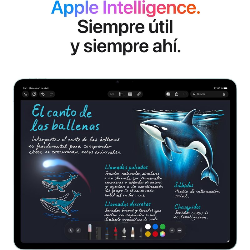 El iPad Air se ha diseñado para Apple Intelligence, un sistema de inteligencia personal que te ayuda a redactar, expresarte y hacer tus tareas diarias sin esfuerzo. Cuenta con revolucionarias prestaciones de privacidad para que nadie más pueda acceder a tus datos. Ni siquiera Apple.