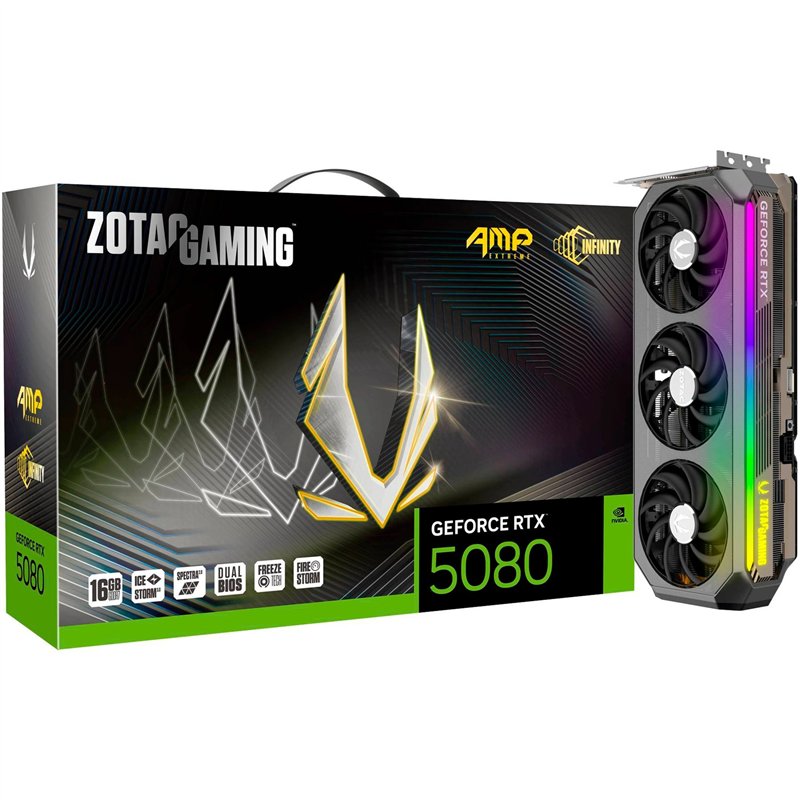 La ZOTAC GeForce RTX 5080 AMP Extreme INFINITY es una tarjeta gráfica de gama alta impulsada por la GPU GeForce RTX 5080 de NVIDIA. La potente serie de tarjetas gráficas GeForce RTX 50 se basa en la arquitectura NVIDIA Blackwell y ofrece nuevos niveles de realismo en los juegos, velocidad y eficiencia energética, funciones de IA como la generación de fotogramas, la generación de varios fotogramas y experiencias de realidad virtual realistas. Otras características incluyen trazado de rayos en tiempo real, reconstrucción de rayos, NVIDIA Ansel, con amplias herramientas para tomar capturas de pantalla en juegos, así como NVIDIA G-SYNC, G-SYNC HDR, NVIDIA DLSS 4, ShadowPlay, Highlights, NVENC Gen 9, AV1 Encoder y Decoder. La GPU instalada en el ZOTAC GeForce RTX 5080 AMP Extreme INFINITY tiene 10752 núcleos CUDA. La memoria GDDR7 de 16 GB tiene un controlador de memoria de 256 bits.